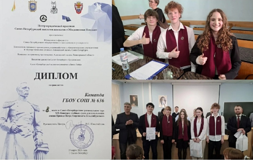 В рамках дополнительной общеразвивающей программы "Учебные суды" 15 марта 2026 года команда ГБОУ СОШ № 636 на юридическом факультете СПбГЭУ приняла участие в региональном туре XIX Конкурса учебных судов для школьников имени Принца П.Г.Ольденбургского.